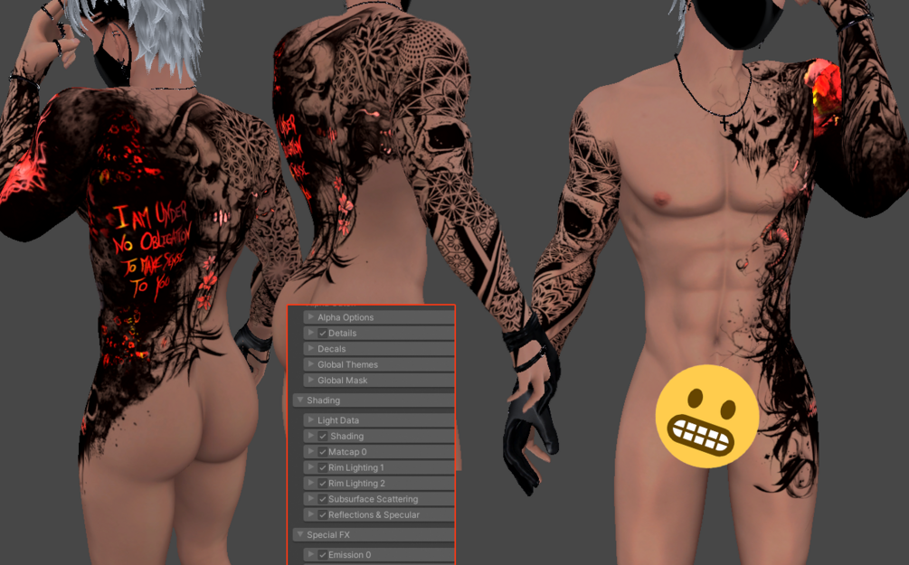 Have some basic Unity knowledge, Unity Materials using Poiyomi 8.1 Toon, which can be found on Poi's Github or Server. If the Material is pink, just re-assign it. All Materials are set up in a decal way, and won't come with any base texture from the original bases / any aftermarket textures out there.