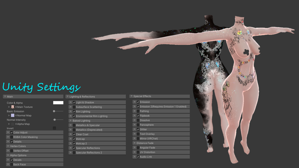 The Unity File is set up, using all of my textures as decals, if you choose to bake your body texture, some settings will require adjustment. Only add your Main Texture, as shown above.