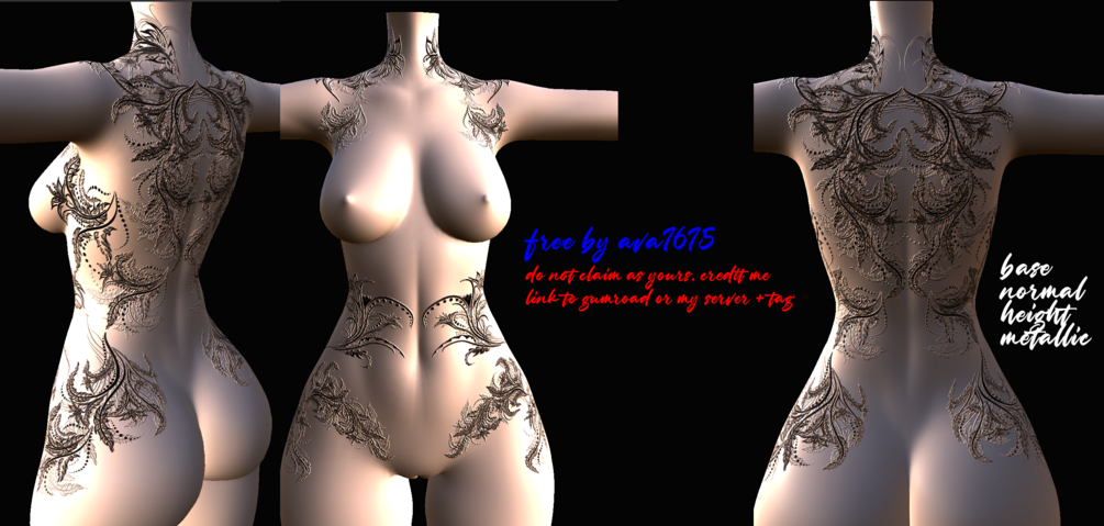 - Credit me if used commercially as the following: "Body Tattoo: Ava#7675 - https://ava7675.gumroad.com/"